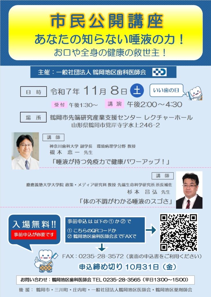 市民公開講座「「あなたの知らない唾液の力!」お口や全身の健康の救世主」」を開催します。